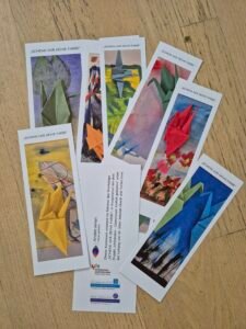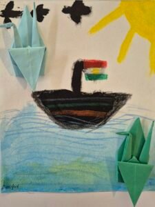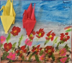 Kraniche sind auch ein beliebtes japanisches Origami-Design. Wir haben Malen und Origami zusammengebracht. Während jemand sorgfältig Kraniche auf das Bild klebte, sagte eine Teilnehmerin: „Ich möchte einfach nur fliegen, wohin weiß ich auch nicht“. Oder ein 10-jähriger Junge fragte „wohin soll ich meinen Vogel kleben?“, und schaute auf das Papier vor sich. „Nach meiner Meinung sind Vögel die Kinder vom Himmel, und sie kommen nur runter, wenn sie die Erde und Blumen vermissen – also du kannst selber entscheiden wohin“, antwortete ich. Eine andere Teilnehmerin sagte: „Ah ja, ich weiß, wo mein Vogel landet, in dem Ort, der mich glücklich machen wird, meine Freunde sind dort.“