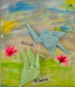 Die Zusammenarbeit mit Menschen aus unterschiedlichen Kulturen ist immer spannend und kreativ. Im Prozess kam jeder entsprechend seiner eigenen Bedürfnisse mit Kranichen in Kontakt. Am Ende landeten Kraniche mit freudigen Geräuschen auf unseren bemalten Bildern. Mit der Unterstützung von Yuriko erlebten wir in unterschiedlichen Sprachen verschiedene Kulturen – eine tolle Erfahrung.